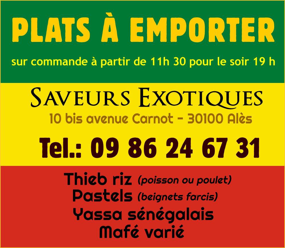 Les amateurs de cuisine africaine seront entièrement satisfaits dans notre établissement. Bienvenue dans le « SAVEURS EXOTIQUES ». Nous sommes impatients de vous accueillir avec notre menu savoureux et de vous offrir une expérience inoubliable. nn Goûtez notre cuisine végétarienne. Les fans de plats sans gluten ou sans lactose sont également au bon endroit. Vous serez surpris du nombre de possibilités de repas sains dont vous disposez.nn Quelle que soit la météo, nos salles climatisées vous garantissent à tout moment des températures idéales.